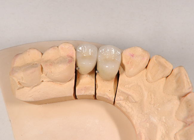 メタルセラミックは、ジルコニアにはできないロウ着が可能なため、複数の支台歯の連結に適した材料です。